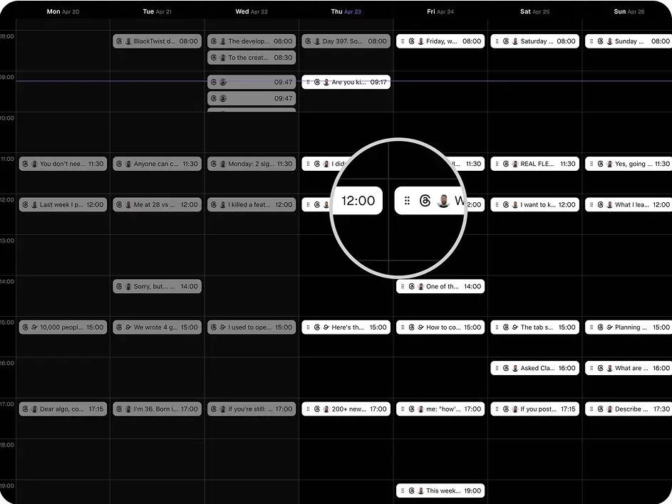 Batch a week — or a month — of content at once. Set your time slots and BlackTwist shows up on Threads even when you can't.