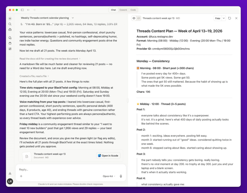 This is Post 2 in the BlackTwist MCP Server series. Post 1 covered the setup and how to schedule a single post. Today we go wider. Full week planning, batched in one sitting.