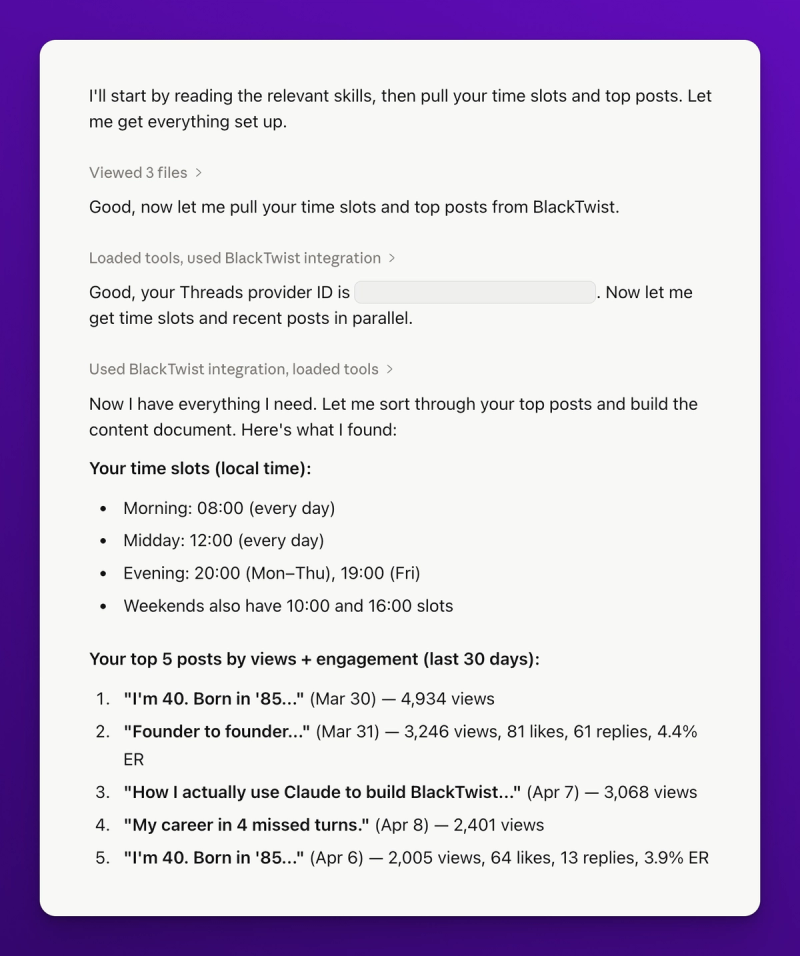 The thread is the interesting one. When you create a thread, Claude passes an array of posts to create_post. The first post is the parent. The rest are replies that BlackTwist will publish as a thread when the scheduled time hits. You don't need to manage the threading logic. BlackTwist does it.