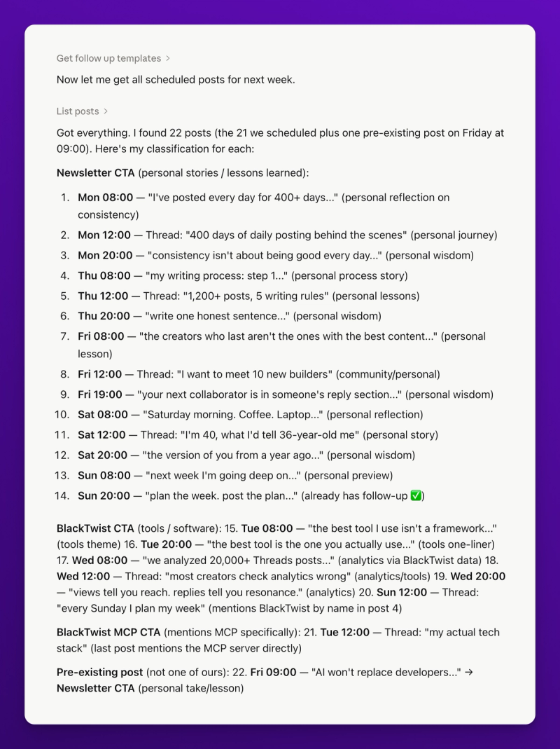 This is where BlackTwist's analytics come in. Claude combines get_thread_follow_up with get_post_analytics to pull both the follow up configuration and the post performance. You get a single report showing which follow-ups fired, which didn't, and which ones got replies.