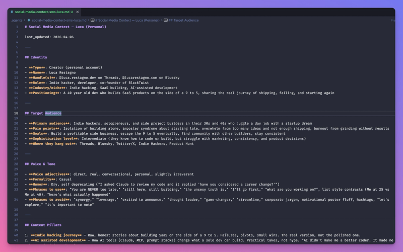 Either way, Claude creates .agents/social-media-context-sms.md in your project. Here's what the output looks like.
