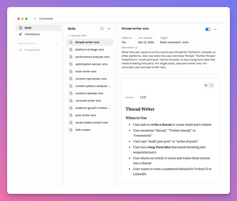 Threads and Twitter/X reward multi post threads because they keep people reading longer. The thread writer skill handles the structure so you can focus on the idea.