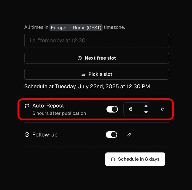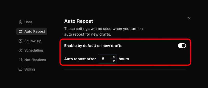 These settings apply to new posts only. You can always adjust or disable Auto-Repost per post when scheduling.