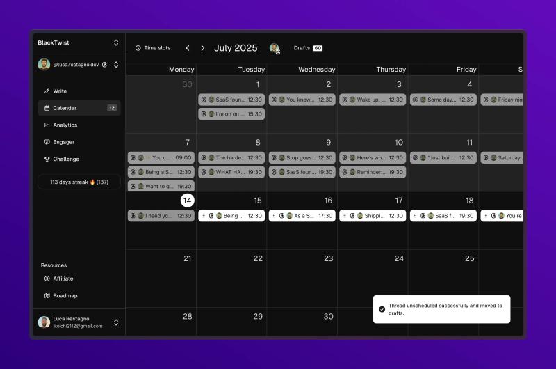 You can click directly on any date in the calendar to create and schedule a new post or thread. This makes it easy to fill gaps and maintain a consistent posting schedule.
