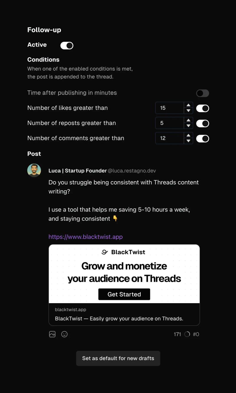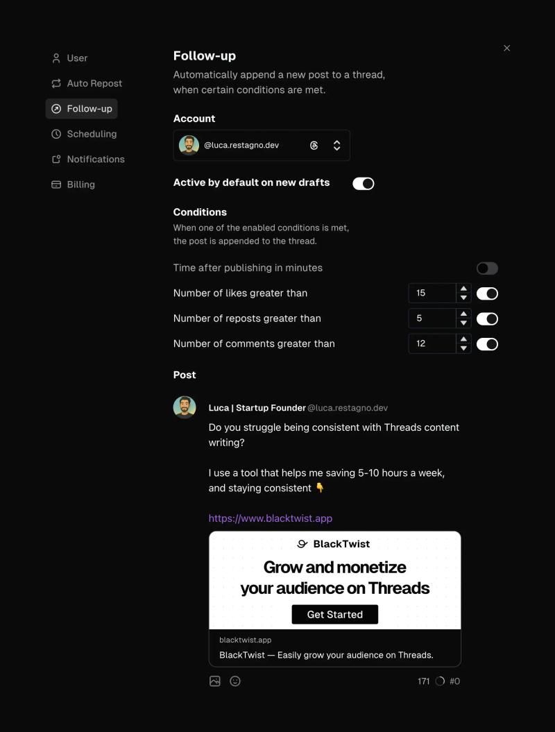 The Follow-up feature (sometimes also called Auto-Plug) in BlackTwist allows users to automatically publish a reply to an existing post or thread based on specific conditions. This tool is designed to help users continue conversations, boost engagement, and deliver timely content without manual intervention.