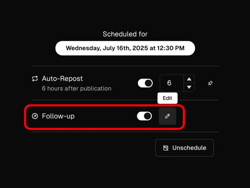 A follow-up is a post that is scheduled to be automatically published as a reply to a previously scheduled post or thread.